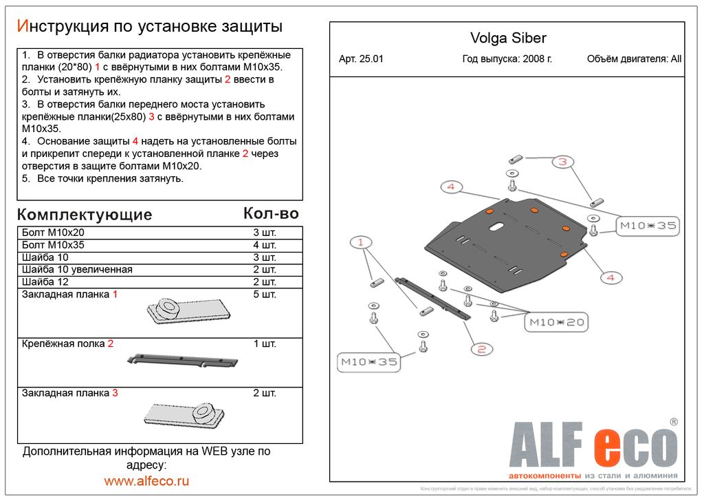 Стальная защита картера изготавливается из холоднокатанной стали марки Ст3СП ГОСТ, окрашена европейской порошковой краской, цвет RAL9005. Конструкция защиты картера предусматривает специальные оцинкованные крепежные элементы для установки в штатные места автомобиля. Доработанная геометрия ребер жесткости дополняет пассивную безопасность автомобиля. Наличие технологических отверстий для слива масла и нормальной циркуляции воздуха в моторном отсеке
